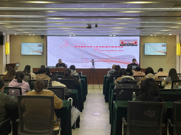 陳勝君教授以《中華人民共和國婦女權益保障法》為主線,結合《湖南省女職工勞動保護特別規定》《湖南省工會勞動法律監督條例》等法律法規,在全面解讀的基礎上,重點從女職工的婚姻家庭、財產分割、家庭暴力、勞動維權、法律援助等相關法律問題,通過典型案例和生動語言作了細致講解,著重從家庭層面、社會層面鼓勵女職工,善于用法律武器維護自身正當的權益。陳教授的講解深入淺出,邏輯嚴謹,內涵豐富,對大家深刻理解和準確把握婦女權益保障法等法律法規有極大的幫助,大家紛紛表示受益匪淺。
